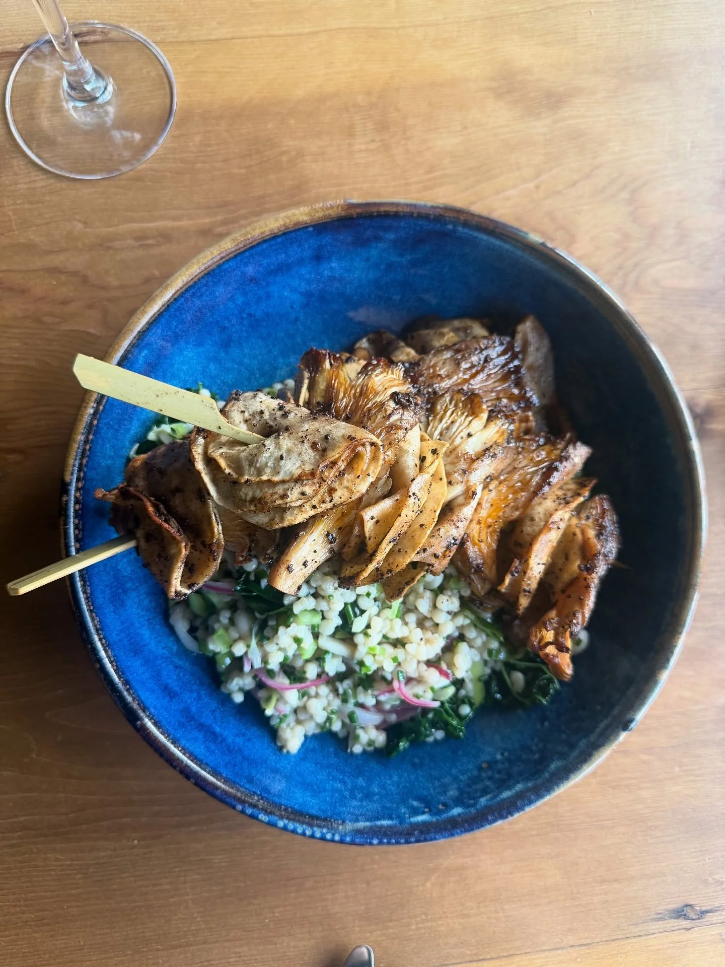 Coffee spiced Celeriac & oyster mushroom skewers, kale & spring onion couscous.