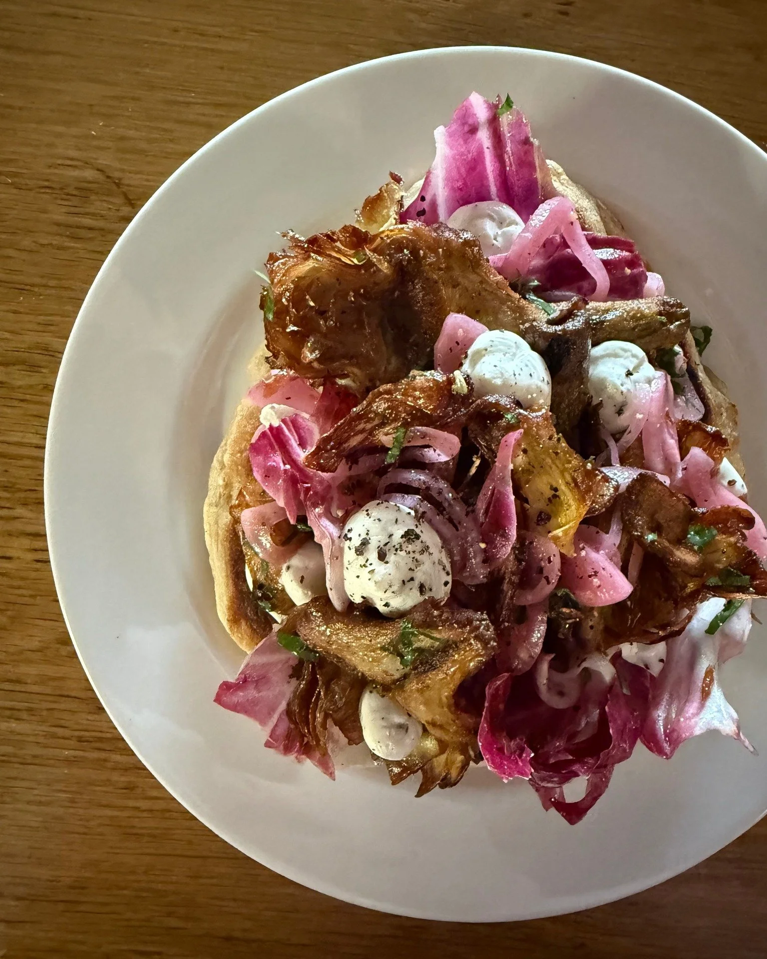 One of our favourite things on the menu at the moment is the new charred flat bread with crispy artichoke, black pepper cream cheese, pickled onion, radicchio