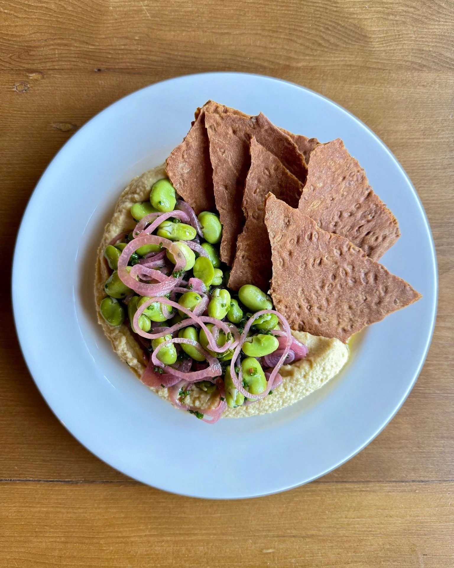 View fullsize Chickpea hummus, broad beans, lemon, linseed lavash