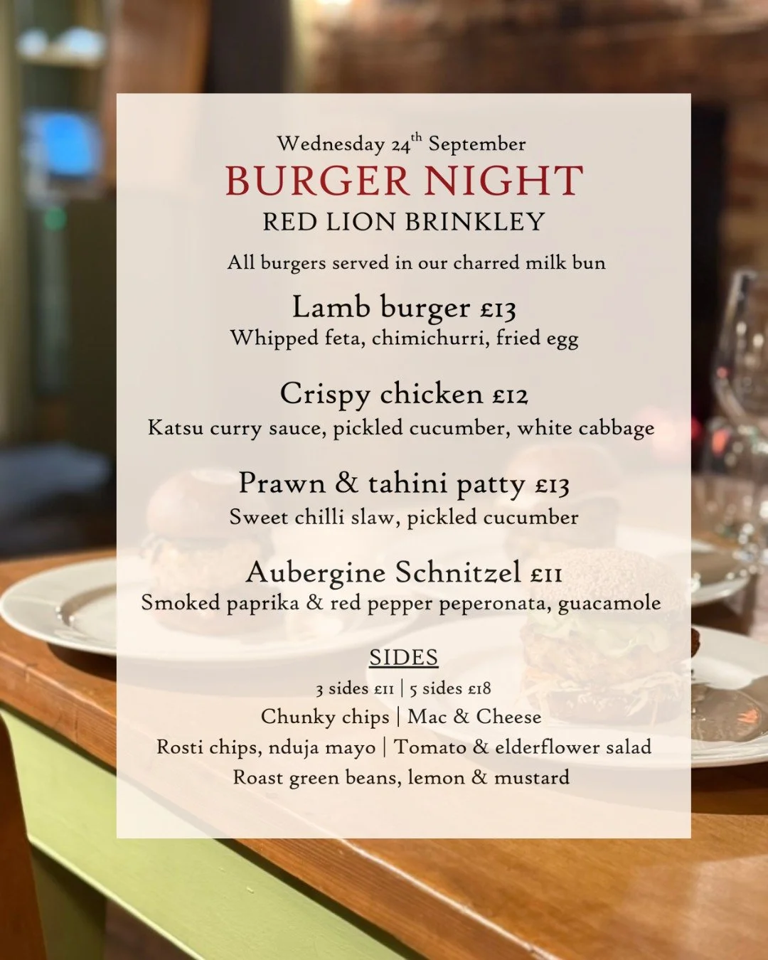 Burger Night is making a comeback, and we are excited to invite you to join us for a delicious evening. Mark your calendars for Wednesday, 24th September, when we will be serving an enticing selection of burgers crafted especial