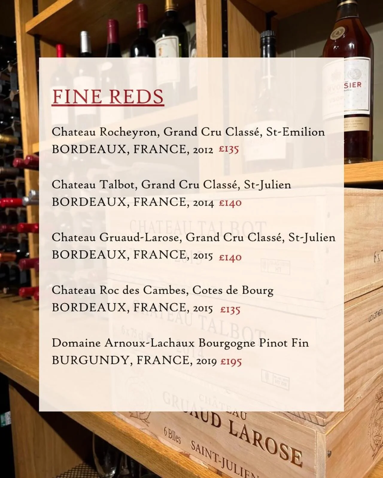 View fullsize Our new, extended wine list is now in stock. If fine reds from Bordeaux and Burgundy take your fancy, this is the list for you! End of Line wines also feature, so some of your favourites from previous lists