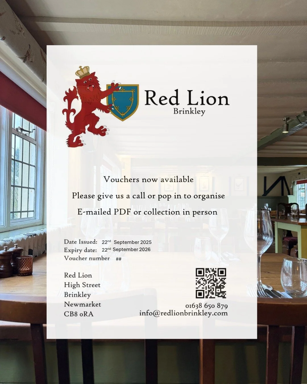 View fullsize We now offer VOUCHERS! Available printed for collection in person, or sent out as a PDF, we'd be delighted to help you organise a voucher as a gift. We can do flexible amounts to suit your preference.
